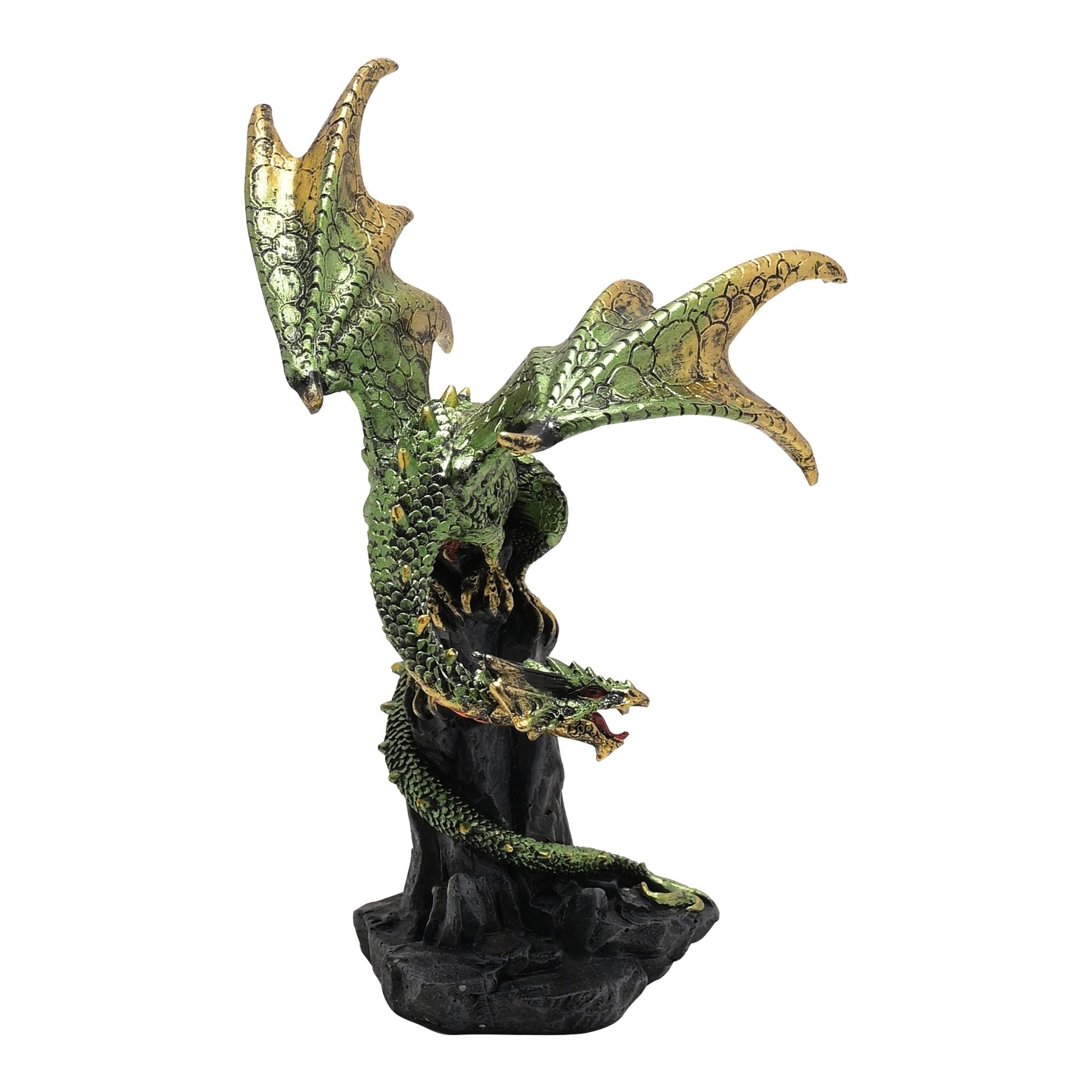 A green dragon on rocks figurine by HOCUS POCUS NOVELTIES®. This majestic figurine captures the mythical world of dragons for those obsessed with fantasy. The resin dragon showcases green and gold colouring throughout. It is completed by a metallic effect finish.