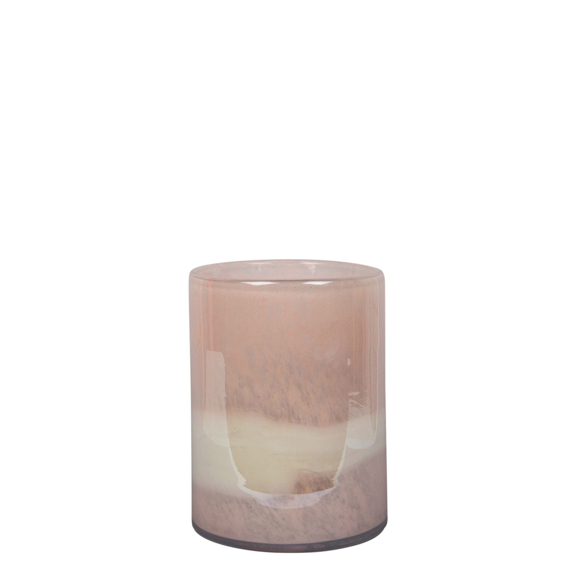 A beautiful handmade blush pink and cream glass vase. From Objets d'Art by SOPHIA® - hand blown and one hundred percent unique. Details: - H:16cm x W:12cm x D:12cm - Blush pink & cream striped design - Cylindrical shape - Hand blown glass vase with unique colour patterns - Perfect for flowers or as a standalone decorative piece