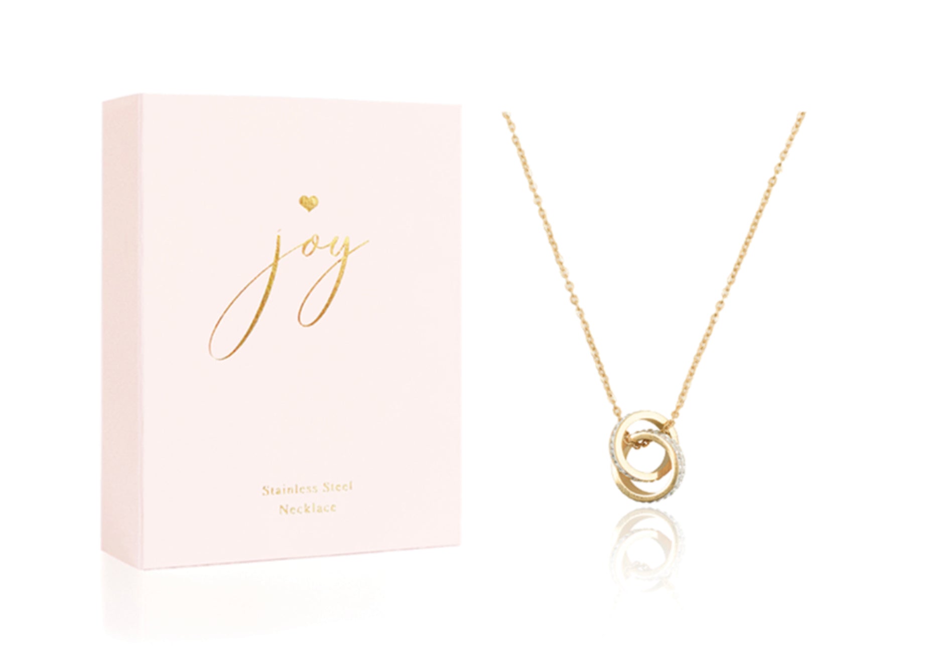 Add a touch of sparkle to your outfit with this delicate and stylish necklace. Stainless steel Gold chain and adjuster with a sparkling interlocking pendant encrusted with cubic zirconia crystals.